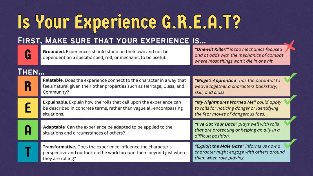 If you changed that to ‘aspects’ it would be equally useful, however. I tend to agree that Experiences are basically a subset of Aspects, specifically focussed on a character’s experience. And that is perfectly fine. I like Aspects.