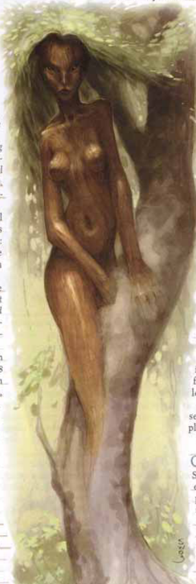 The 4e version, to me, is combat monster. You see this thing, you fight. It's a tree with boobs attacking you! Did you have to fight when you saw a 4e dryad? No, of course not--but you wouldn't know it from the illustration, information, or flavor text. You had to know it from previous editions or from mythology. (that's one of the few problems I have with DH--the adversaries could use a few more sentences of flavor text.)