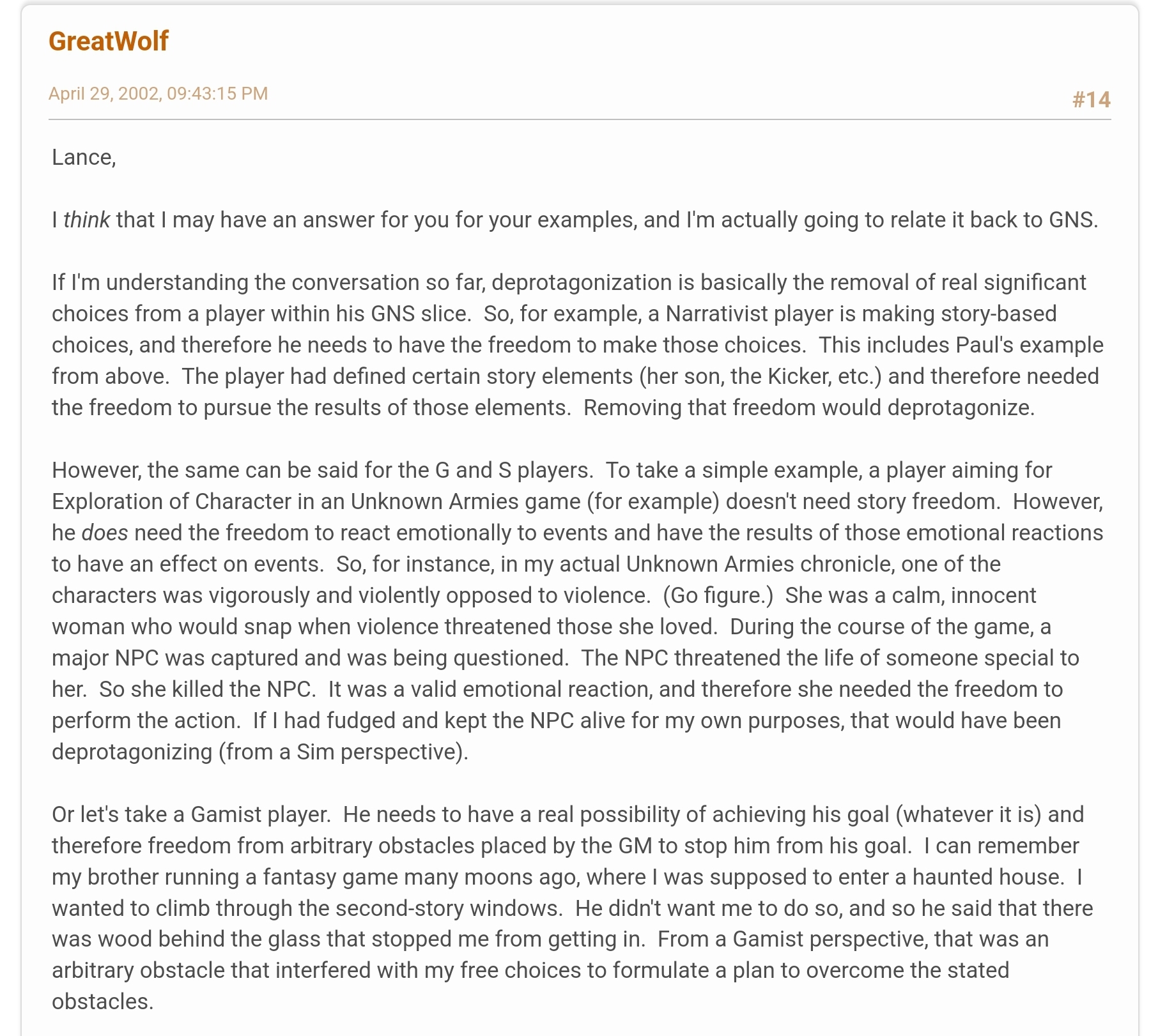 Well, this is a LOT of verbiage to address, but let me just point out that what GreatWolf is saying here is perfectly valid and congruent with what I'm saying! "So, for example, a Narrativist player is making story-based choices, and therefore he needs to have the freedom to make those choices."