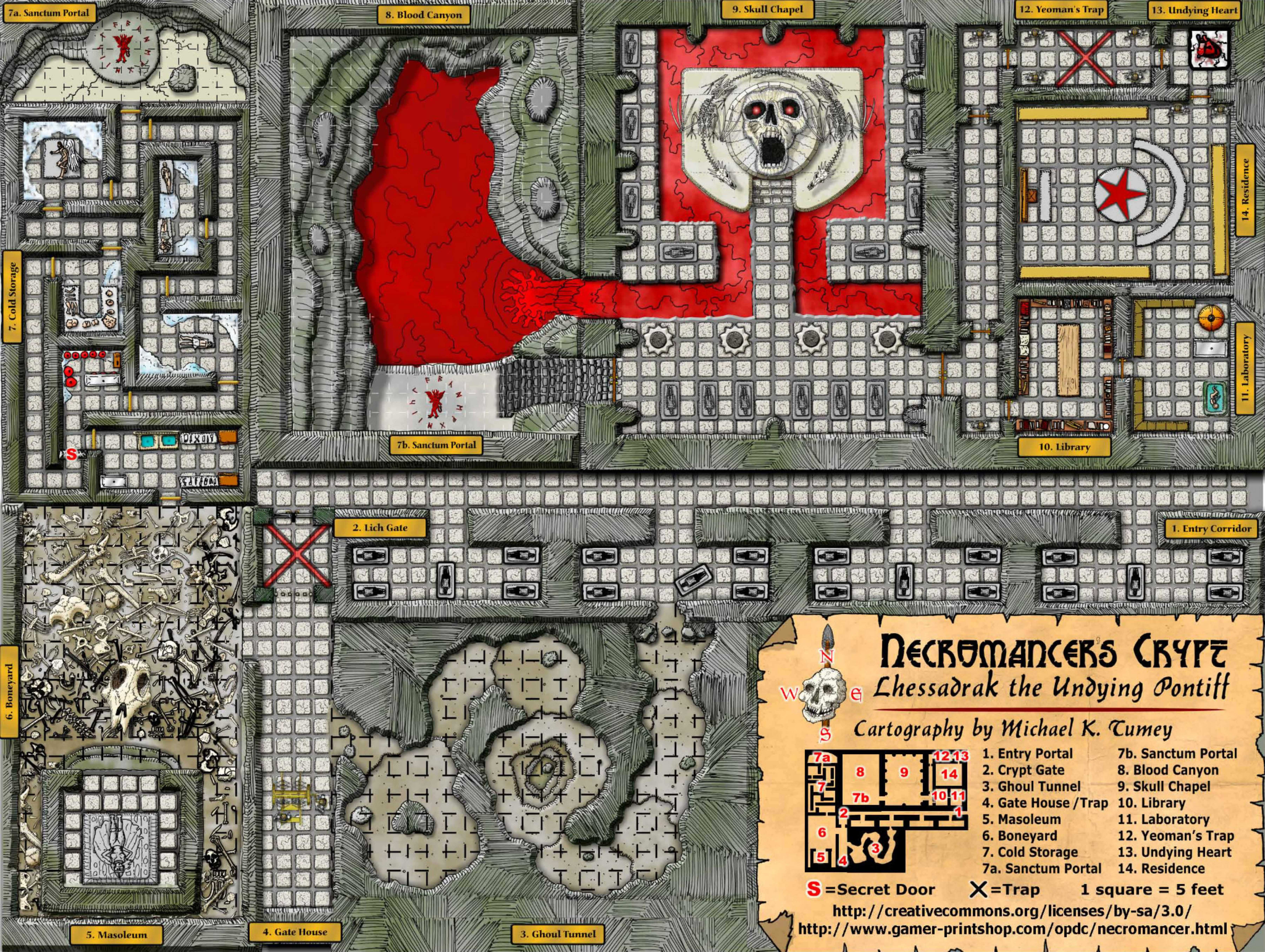 Well, technically (as always) I'm choosing my own maps. These are two maps of the same location, the castle/abbey above the ground and the cellar/dungeons below the ground, created as content for two different map contents. The dungeon level I created for the 2008 One Page Dungeon Contest, and the other created 6 months later for a Cartographers' Guild Map Challenge doing speed mapping. I decided when doing the latter one, it should be the abbey above the dungeon I previously created. These were done in my hand-drawn style, and are among my earliest maps as I began my freelance cartography career, and I've always wanted to publish these as part of an adventure they certainly belong, just never got to doing that. I imagined Lhessadrak as a clerical lich, once a powerful force of good, but when his wife, a paladin was killed in a battle against an undead army, he fell from grace, eventually leading him on the dark path to lichdom. He converted to the Church of Orcus and eventually became it's pontiff, at which point the abbey was constructed for his unholy rites. The dungeon is my favorite of this pair of maps, but both are necessary for an adventure location. I imagined Lhessadrak discovering the existence of and access to the Plane of Blood... enjoy!