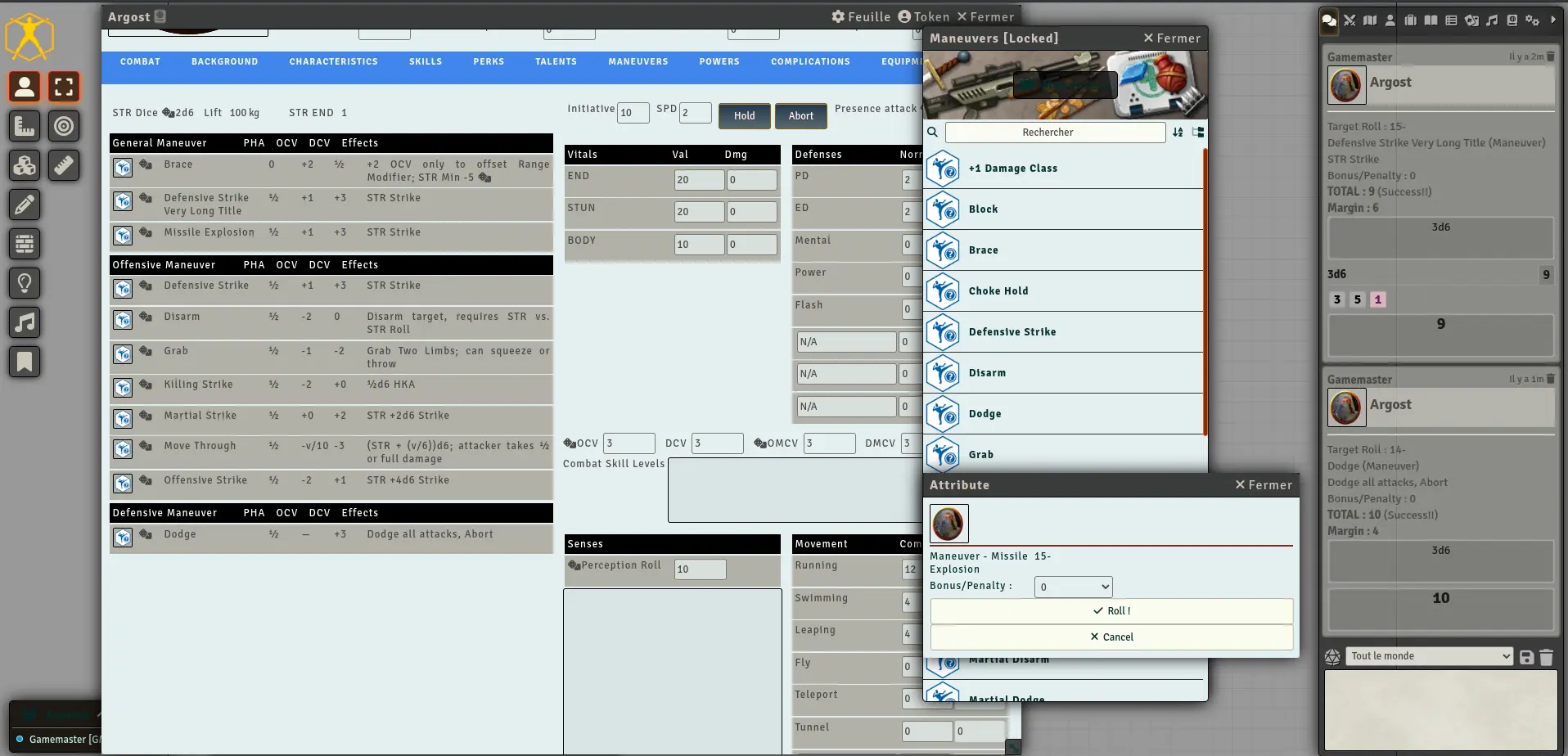 I'd have to play around. I'm not sure I would want to try to type such rolls into a chat. I would use macros. I see that there is a Hero System game system for foundry. It'll be interesting to create a world in that system and see how they handled it.