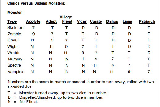Turn Undead is handled using a table that compares the Cleric’s level to the undead type. The result is a target number (7, 9, or 11) that must be matched or exceeded on 2d6. A "T" means an automatic turn, while a "D" result "dispells/dissolves" the undead. "N" indicates the undead is too powerful to turn.