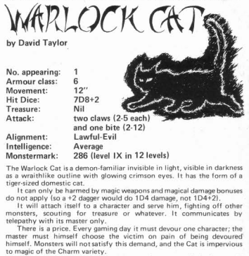 - Warlock Cat (David Taylor) a strange companion cat that is visible only at night, and must devour a character to stay with a group.