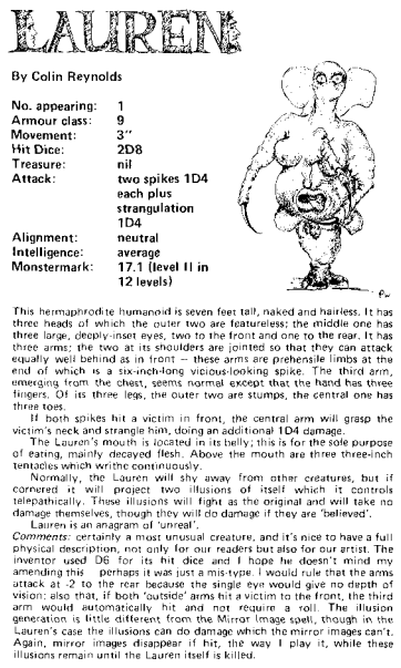 A collection of new monsters created by readers. This month they add an Intelligence stat in line with the new Monster Manual and list the Intelligence of the previous Fiend Factory creations:- Doken (Ian McDowall) a big hairy ape that really only gets upset if you steal its stuff. Seems fair to be honest.