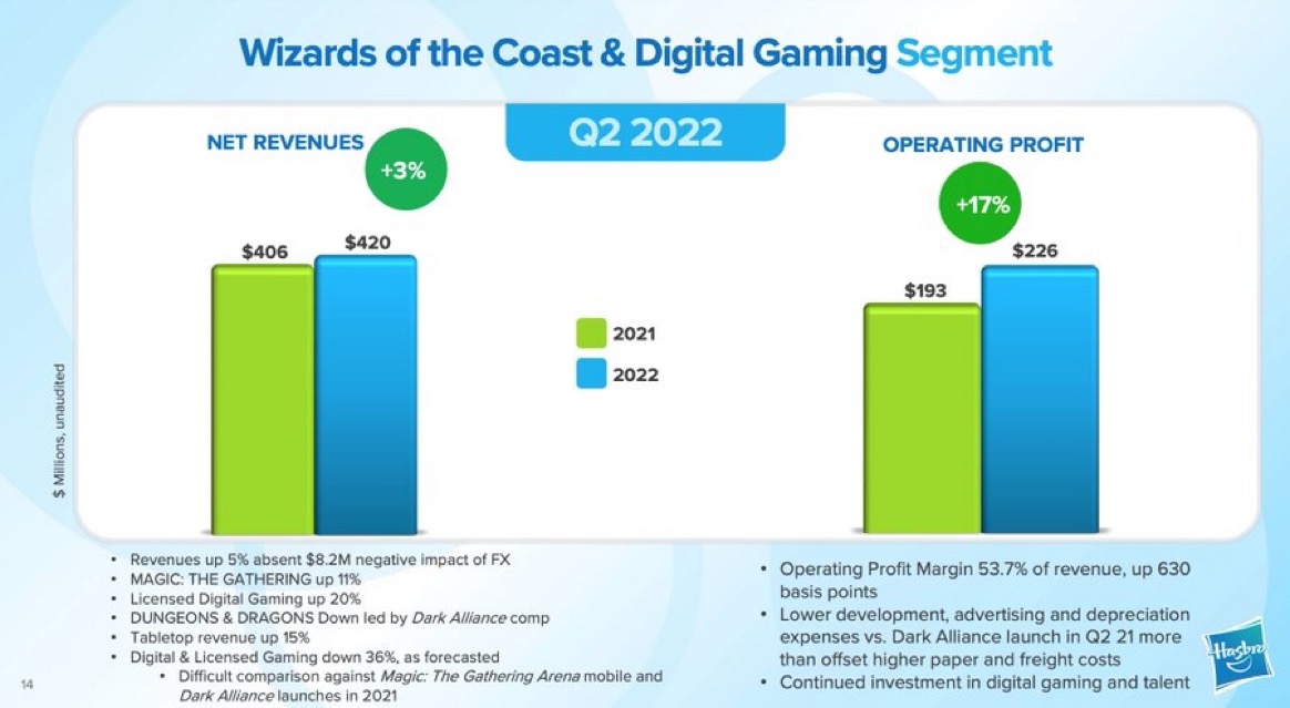 One small surprise was that Dungeons & Dragons actually had a down quarter compared to 2021. This isn't due to a decrease in tabletop game sales, but rather due to Dungeons & Dragons: Dark Alliance coming out during 2Q2021.