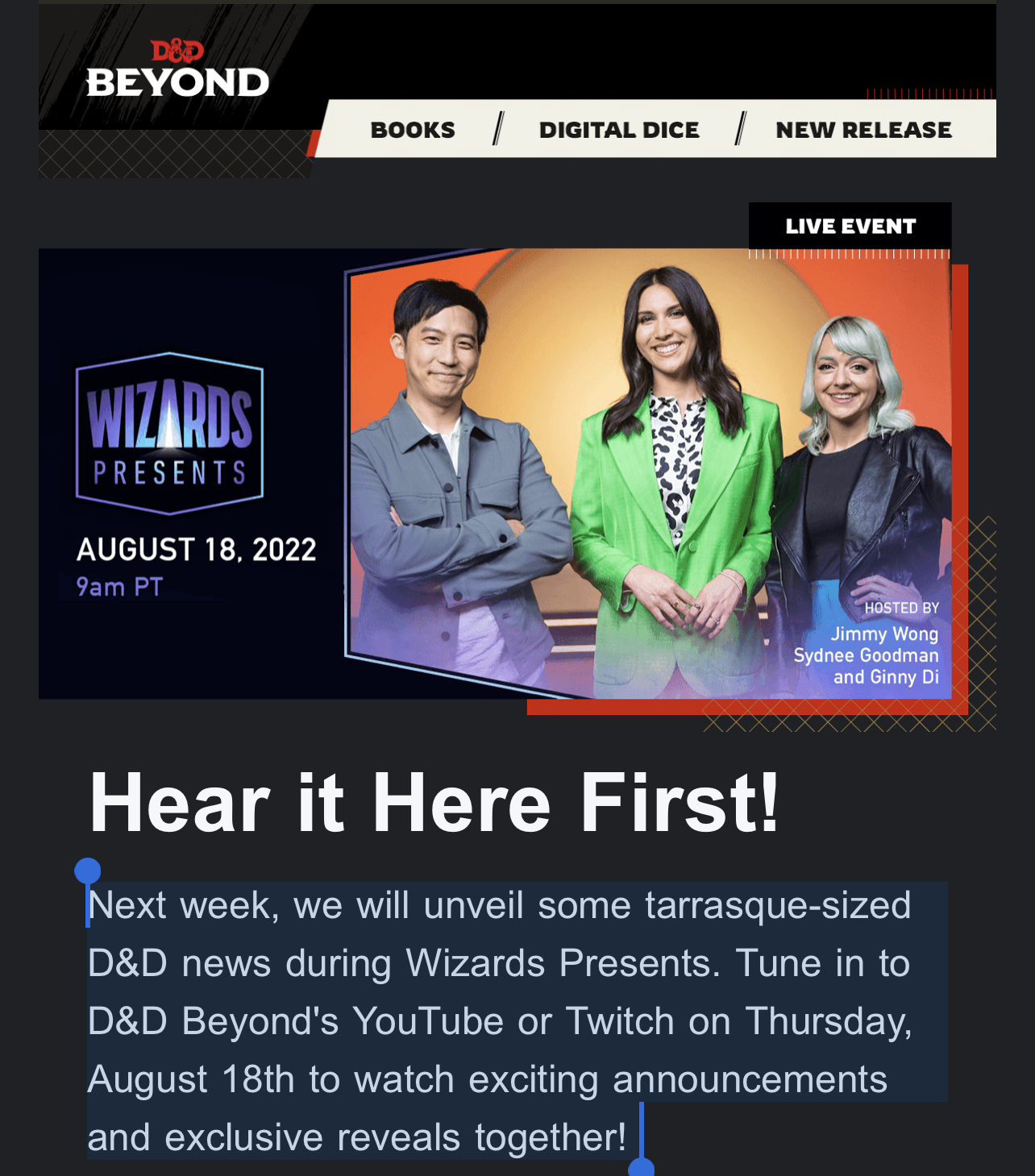 Next week, we will unveil some tarrasque-sized D&D news during Wizards Presents. Tune in to D&D Beyond's YouTube or Twitch on Thursday, August 18th to watch exciting announcements and exclusive reveals together!
