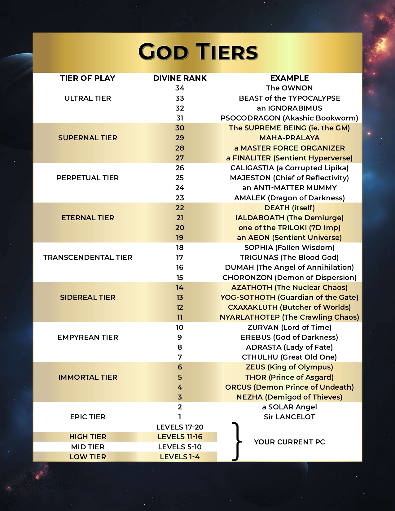 I’m slightly intrigued but also overwhelmed by your chart, but maybe I’m missing some context about your game. That’s a lot of tiers of deities, and it’s not obvious to me what the differences are. (Probably the fact that I don’t recognize about half of them is a contributing factor.)