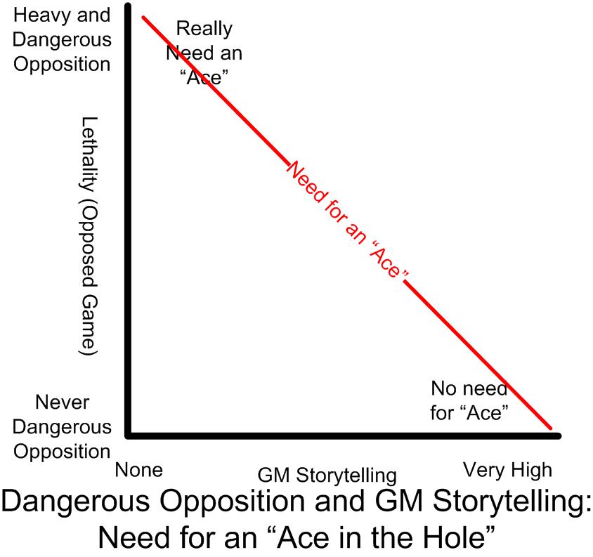 There’s a big caveat to this. Some RPGs have reduced danger to the characters to almost nothing. When I first discussed this “ace in the hole” idea with a friend he said only when somebody did something really stupid in his game did they risk dying. If the participants are not really afraid of death then they don’t need an ace in the hole. You can play a game without spell casters or perhaps without magic at all, and that will work out. On the other hand, if you play in the older style where the RPG is a game that the players can lose if they are really unlucky or play poorly, then an ace in the hole is definitely needed because without one the players will be overwhelmed.