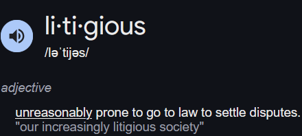 You've got the dictionary definition of "litigious" down, for sure. But for most folks, the word means "being sued". WotC has not sued anyone over this issue. That's why you're getting pushback on that claim.