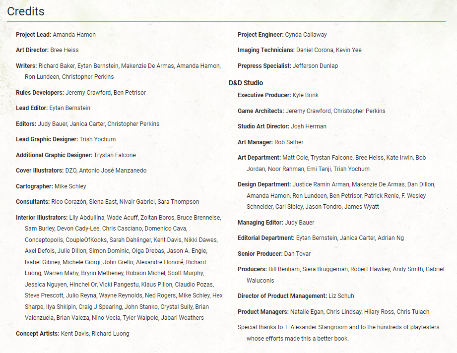 I know that Wizards has hundreds of people involved and previously hit issues with the number of people in credits for D&D books, so pulled back from crediting some roles.