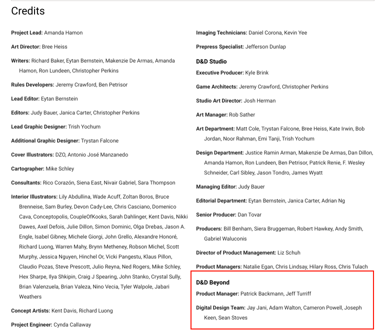 Adding the team to the credits pages just on D&D Beyond was, as I mentioned above, a compromise while we figured things out.