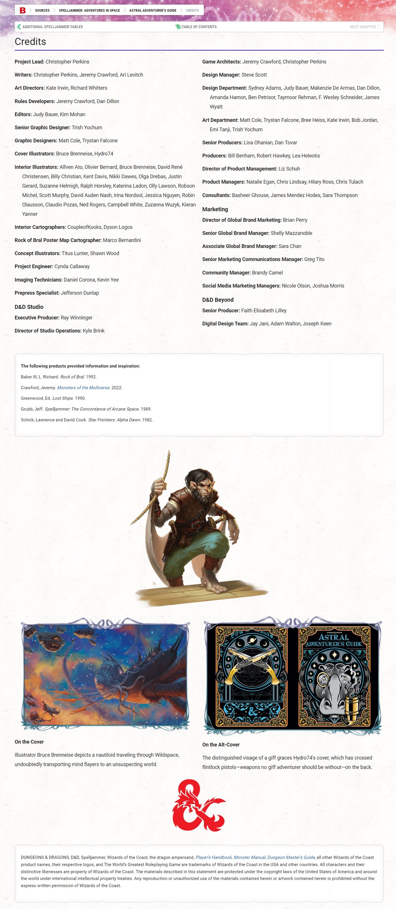 Hi, I've noticed that on D&D Beyond, several team members who contributed to books such as Spelljammer are no longer credited in the bylines on the digital books. I have uploaded a screenshot of a previous version of the url shown above, and it shows the original bylines including the Senior Producer for D&D Beyond and the Digital Team Members, and they no longer show up on the credits as seen in the url above.