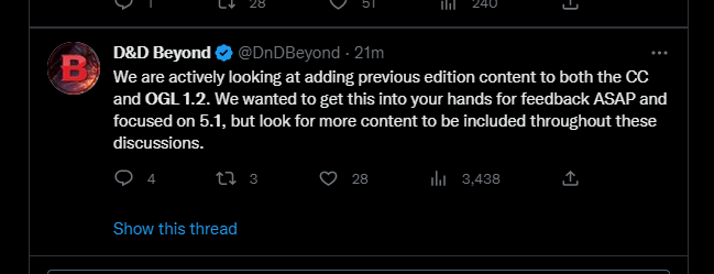 As promised earlier this week, WotC has posted the draft OGL v.1.2 license for the community to see. A survey will be going live tomorrow for feedback. https://www.dndbeyond.com/posts/1432-starting-the-ogl-playtest The current iteration contains clauses which prohibit offensive content, applies only to TTRPG books and PDFs, no right of ownership going to WotC, and an optional creator...