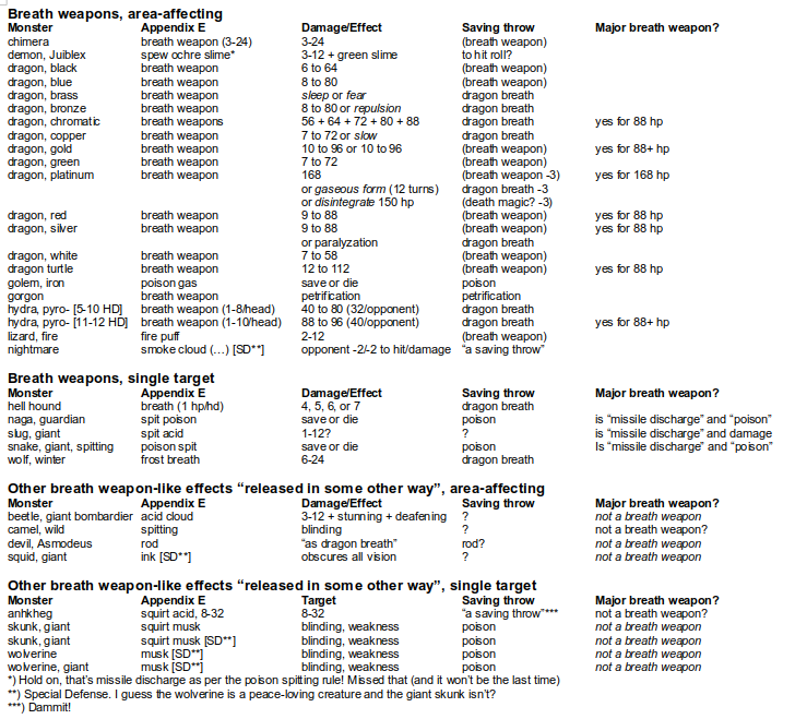 The second is that some breath weapons allow for different saving throws. Not sure what to do with this, but this obviously includes the gorgon, which has “breath weapon” in Appendix E instead of something including words like “petrifies” or “turns to stone”, which sucks. And what about the iron golem, which "will breathe out a cloud of poisonous gas" and has “poison gas” in Appendix E?