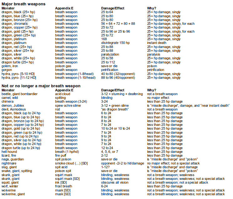 In any case, all of this suggests that simply going with Appendix E “breath weapon” as the basis for a “major breath weapon” doesn’t seem right. For why would the gorgon’s “breath weapon” be a “major breath weapon” and the iron golem’s “poison gas” not be one—and not even be a breath weapon at that?