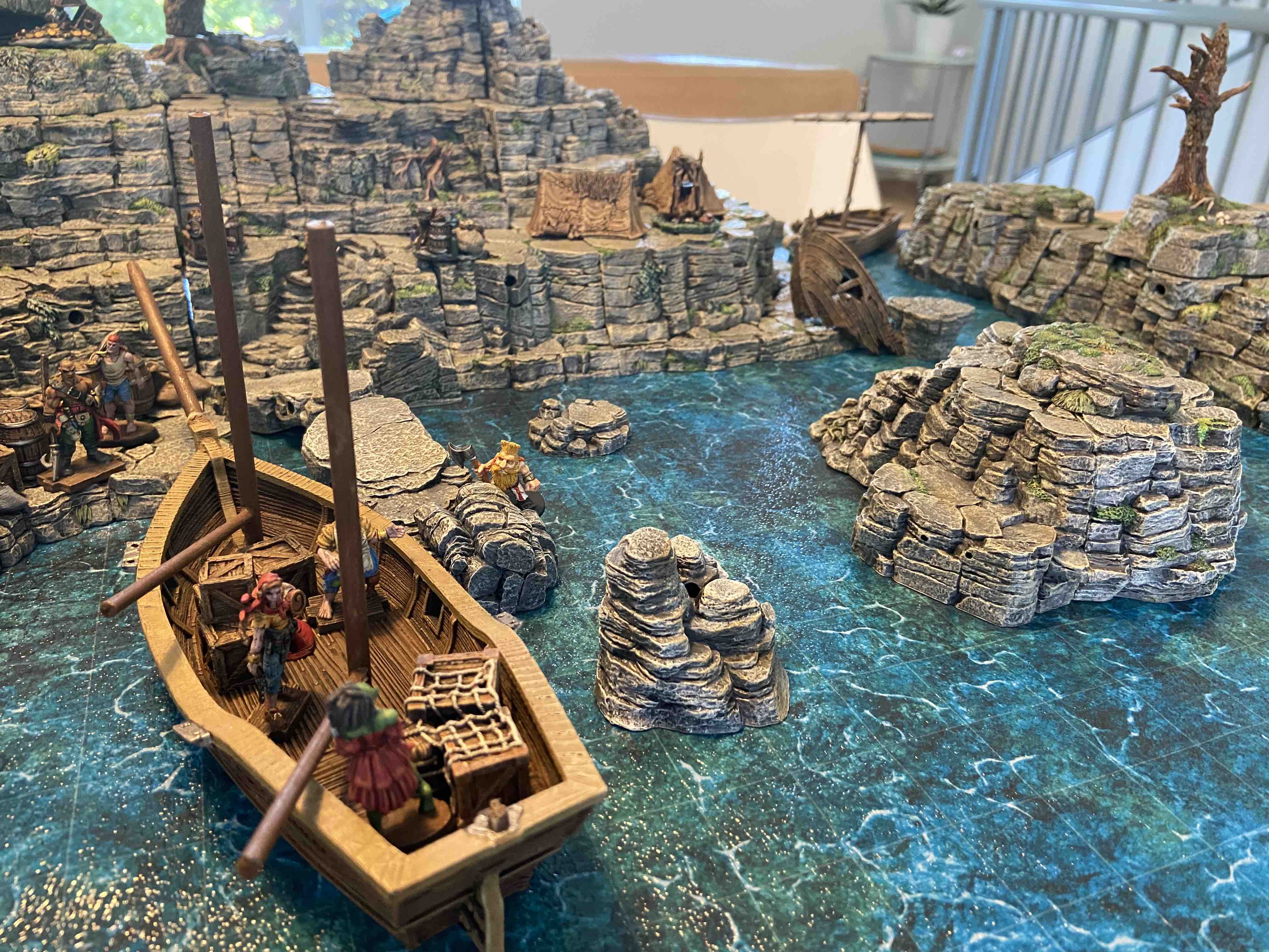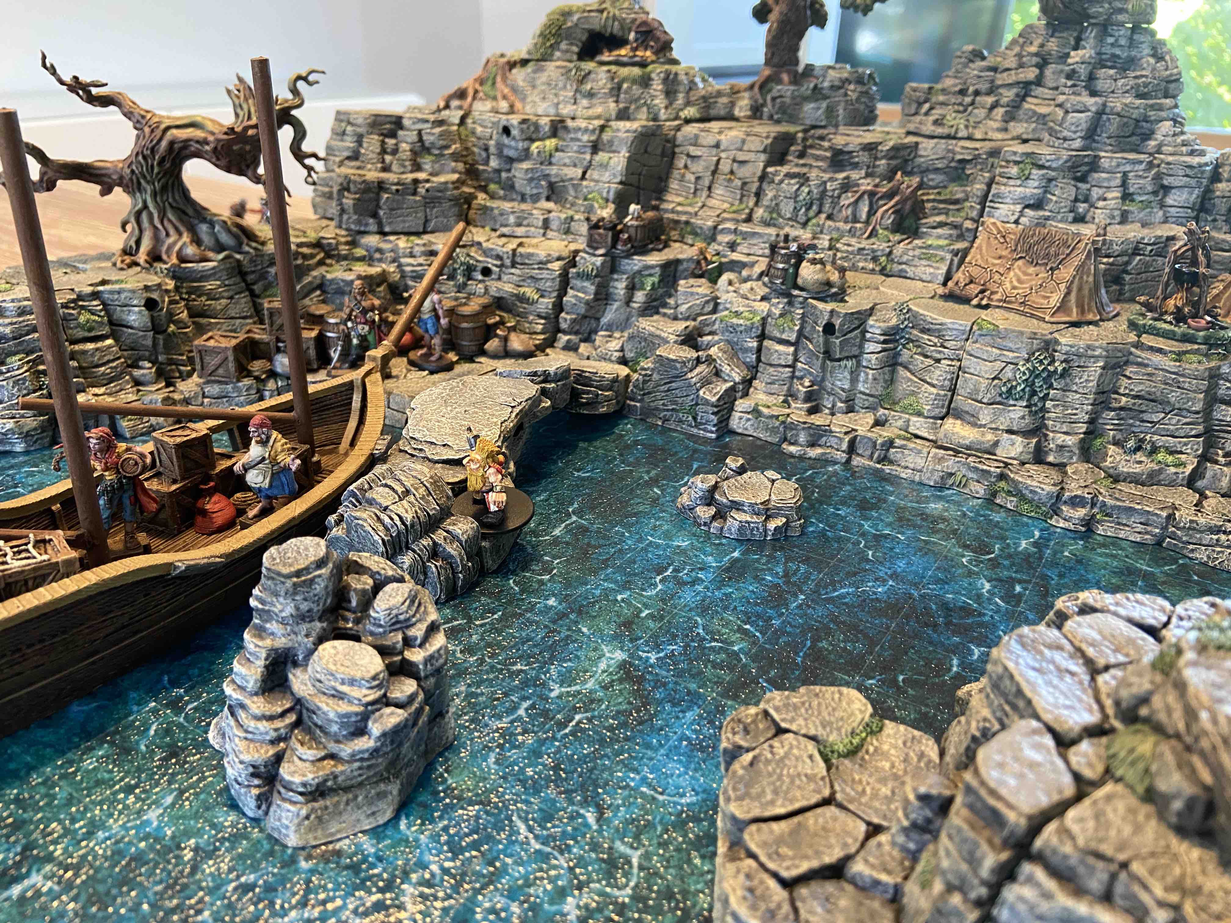 First, what a beautiful build. Absolutely awesome! I love everything about it: the minis, the set pieces, the leveling. It has what very few photos of builds have - a "living" scene. Great job!Cliffs are hard because they take a lot of terrain (i.e. $$$) for very little table coverage, so the best examples I have seen are from folks who make them out of foam, or Dwarven Forge, but that is probably the single most expensive thing you can make out of Dwarven Forge. DF wilderness terrain is around half price if you paint it yourself, but it is much, much more detailed and time consuming to paint than their dungeons or caverns (I can paint a whole dungeon set in about 2 hours, caverns in 3, but wilderness or Hellscape is probably 5 times as long - though that said cliffs are much easier than forest tiles).